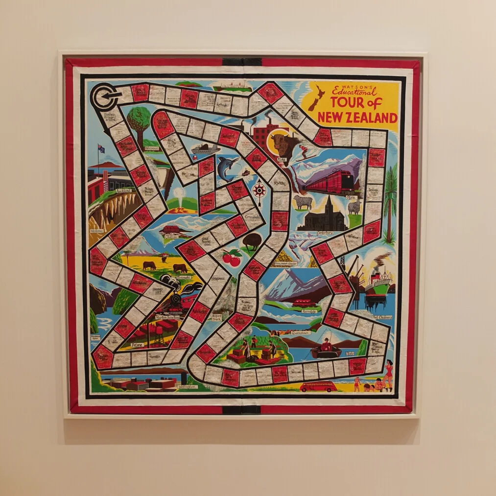 A painted inspired by the “jeux de l’oie” with the different places in New Zealand.