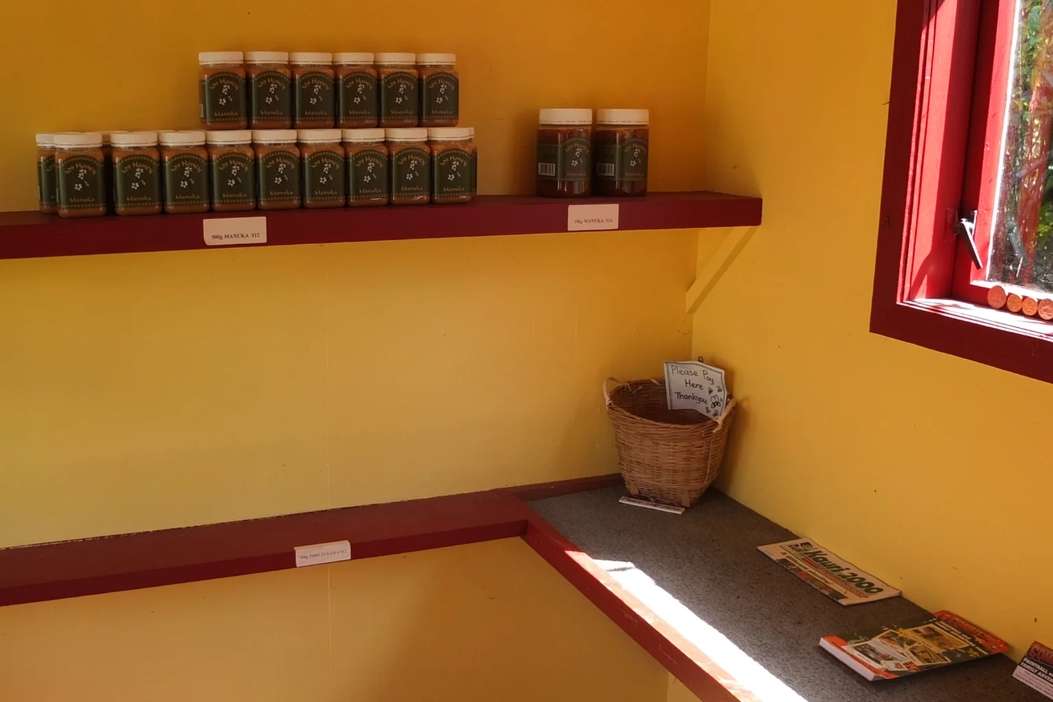 Some honey and a basket. I like the concept. I could take 5 pots and give them 5 dollars but I’m honest and honey is such a good product 🙂 New Zealand feels like a very safe country where people trust each other. How nice!