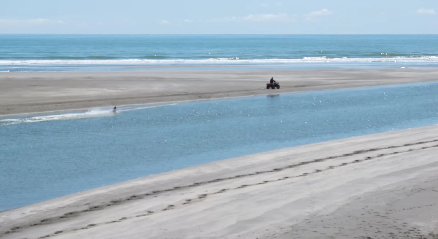 There is some courageous people already in the water. The little guy or girl, is surfing while being pulled by the quad. Looks cool.