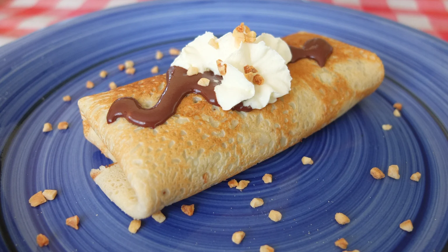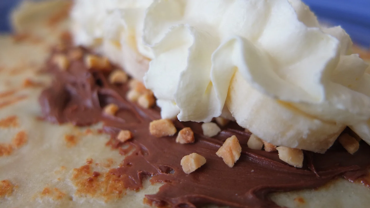 Hey, I’m lucky today because there are still crepes left in the fridge. I could make a presentation like we did yesterday night for dinner. Chocolate, wiped cream, nuts and banana should be delicious ;-).