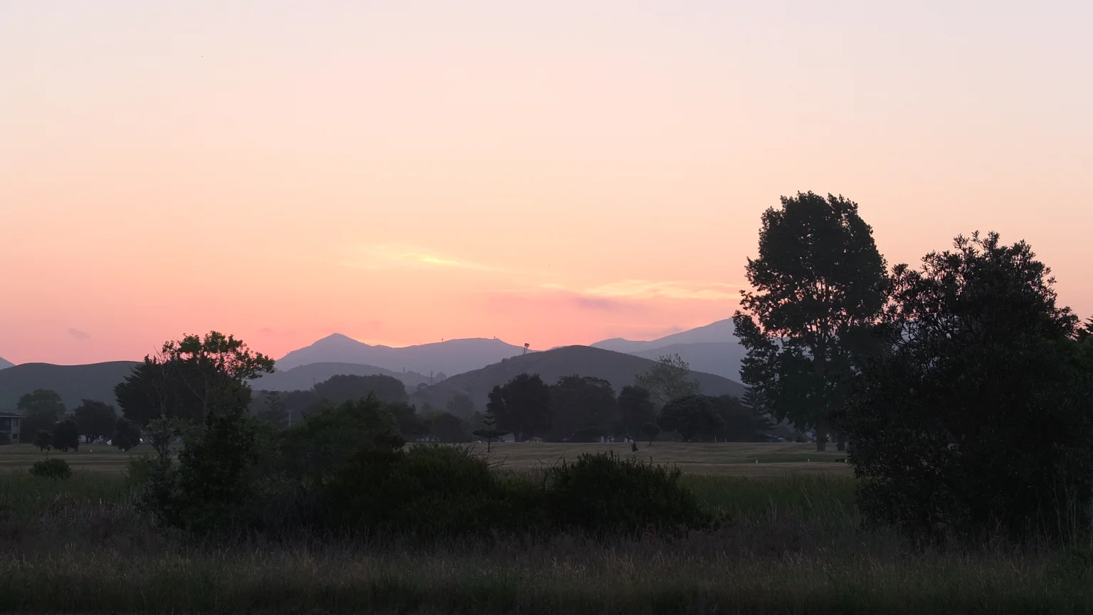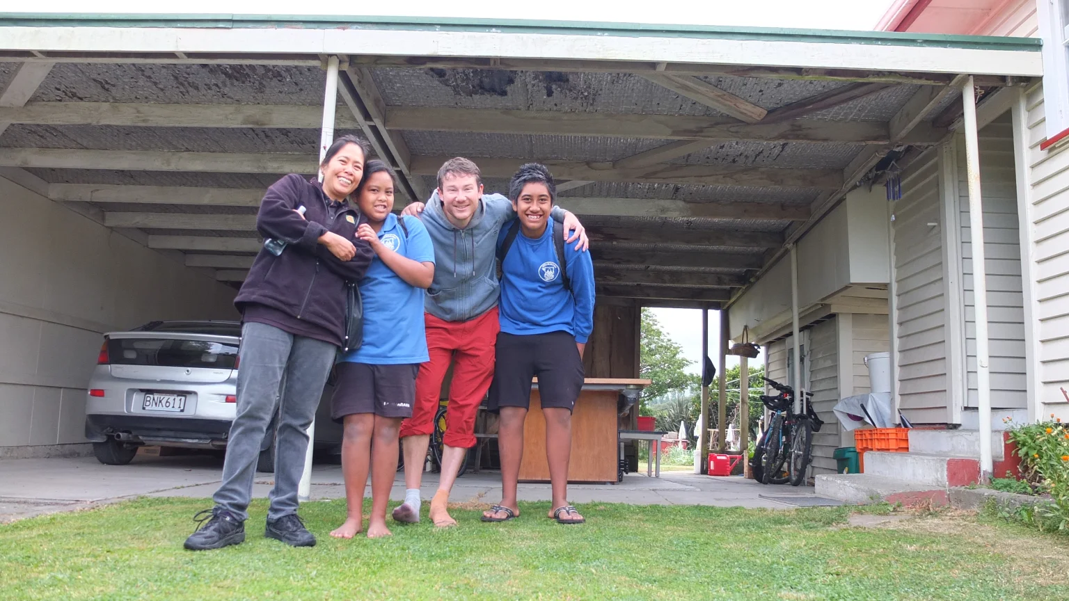 Surrounded by grass, trees, sheep, cows, birds and sometimes flat possums :-).