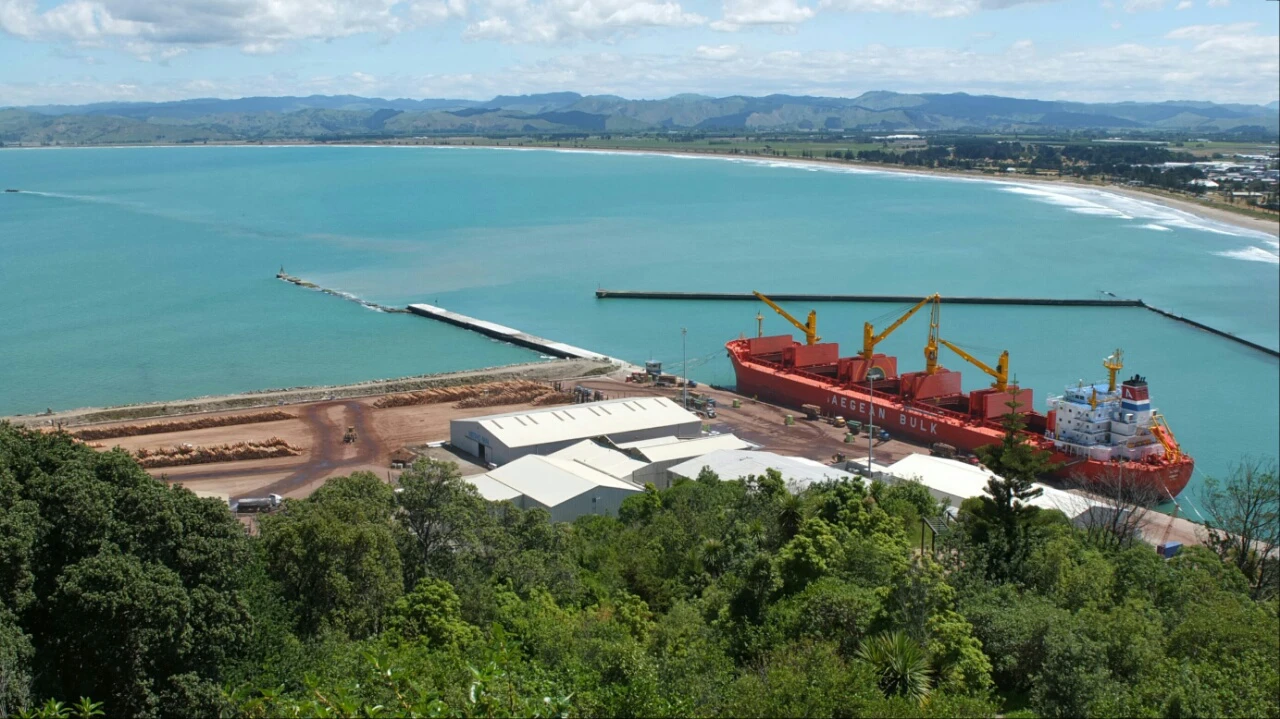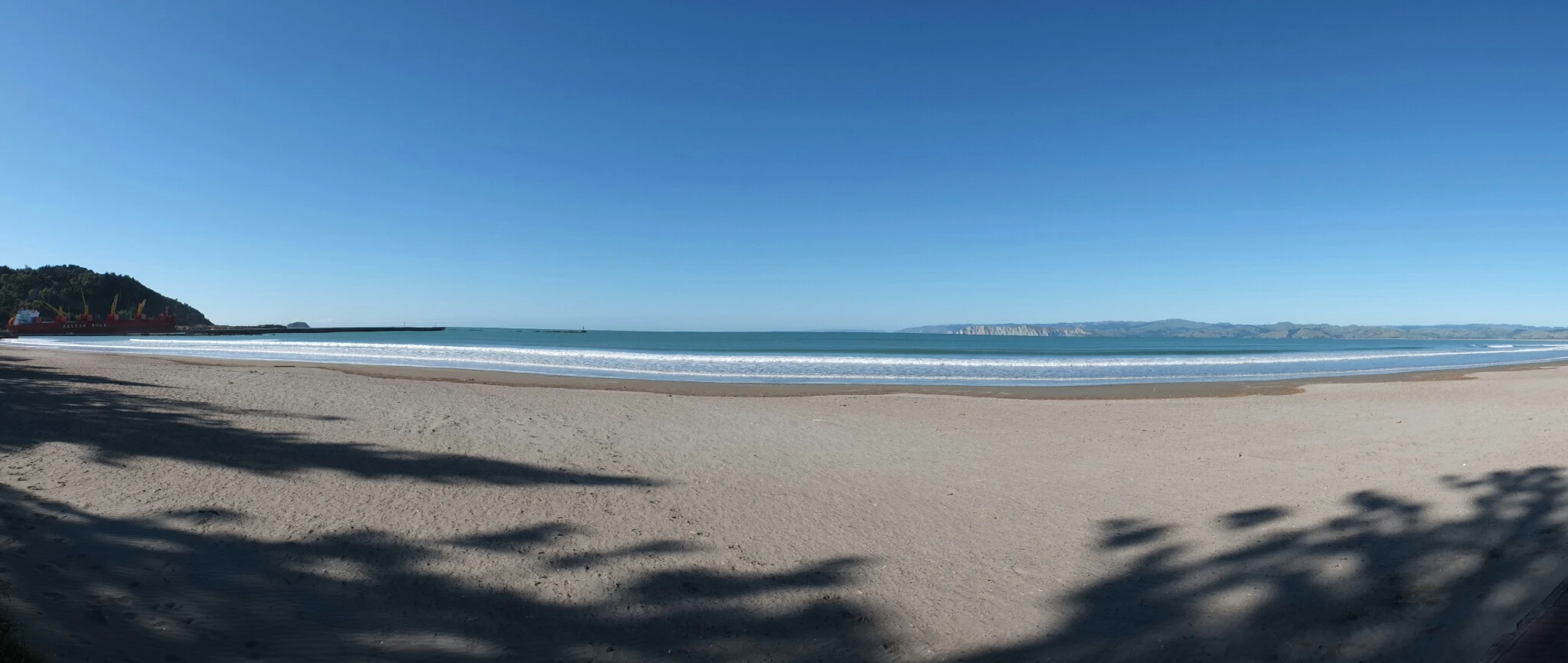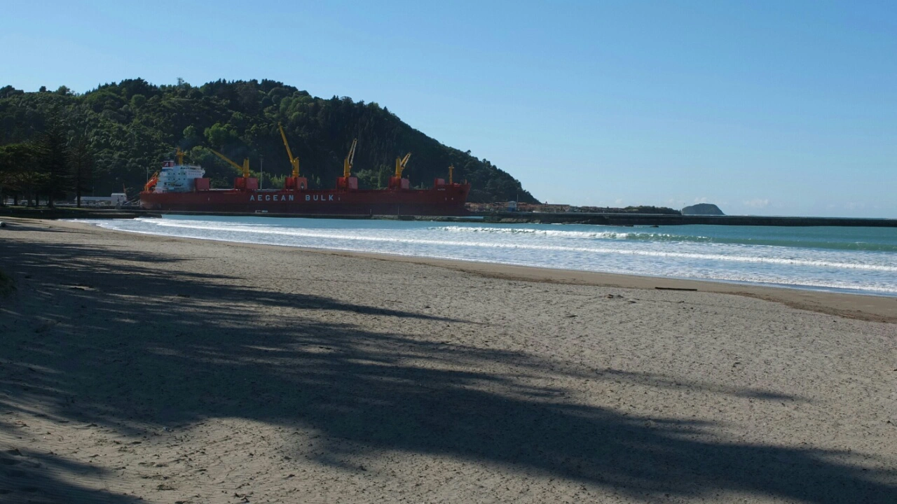 The bay and the container boat. The logging trucks are busy dropping the wood for the boat to transport it further somewhere.