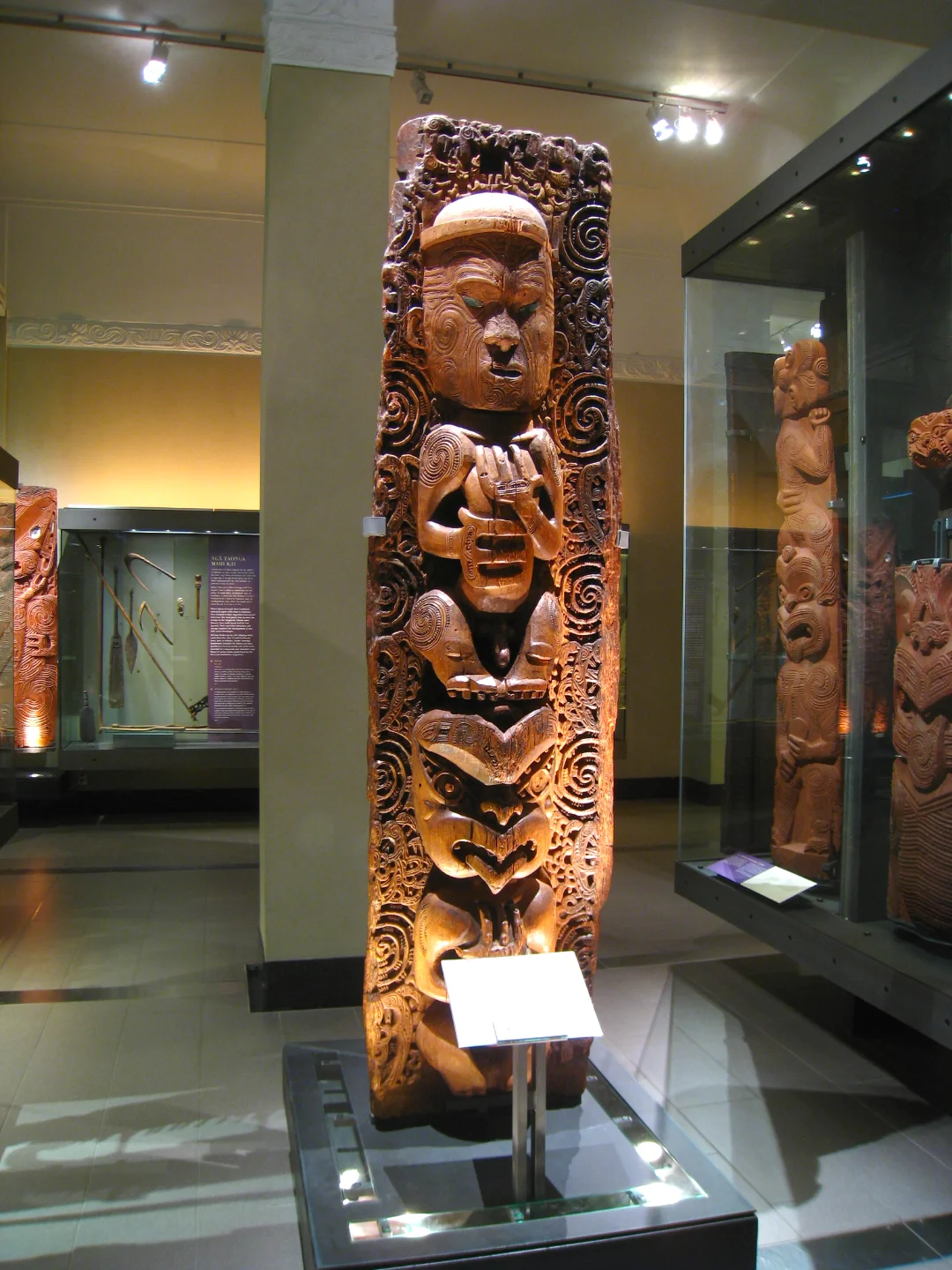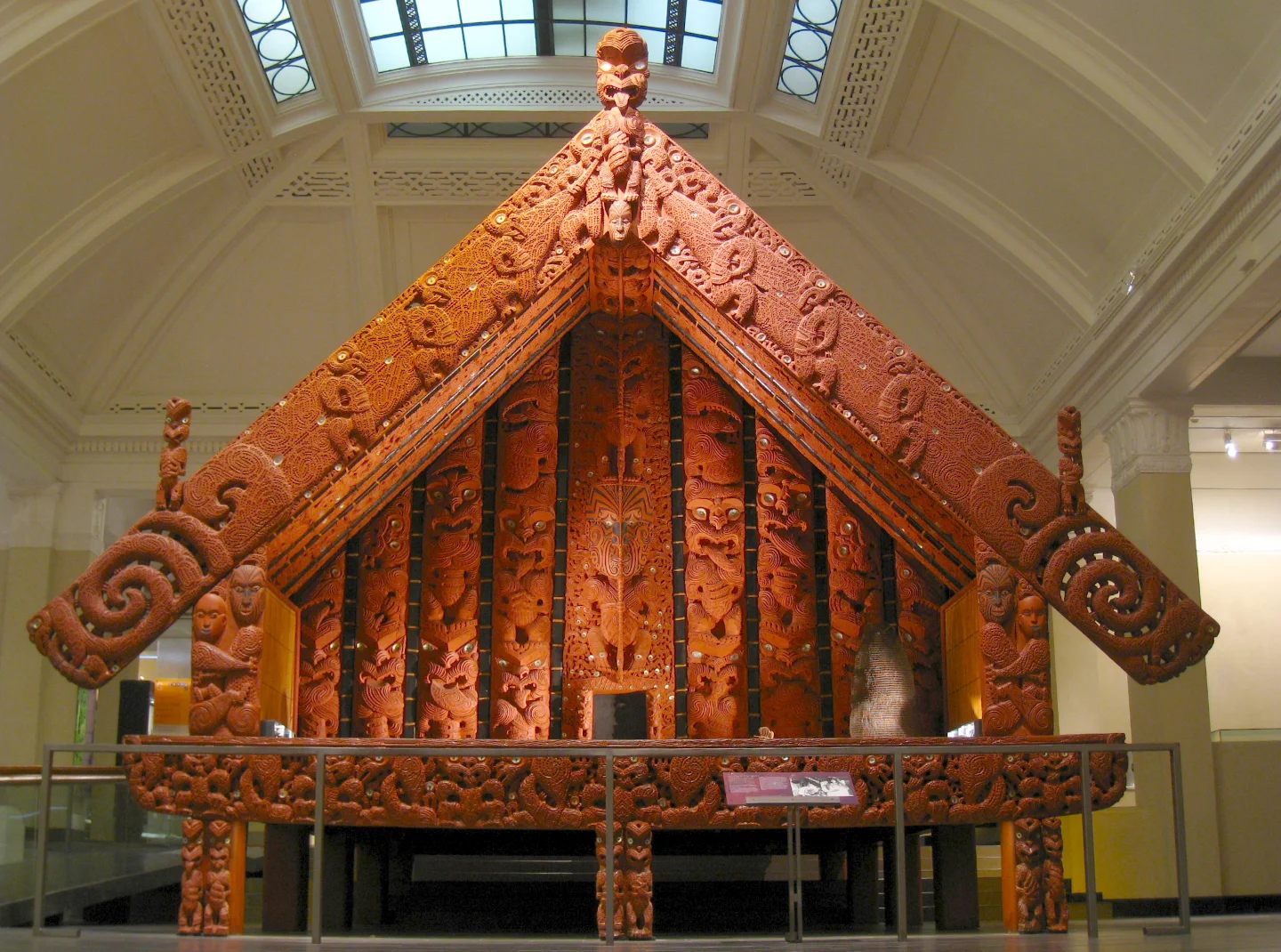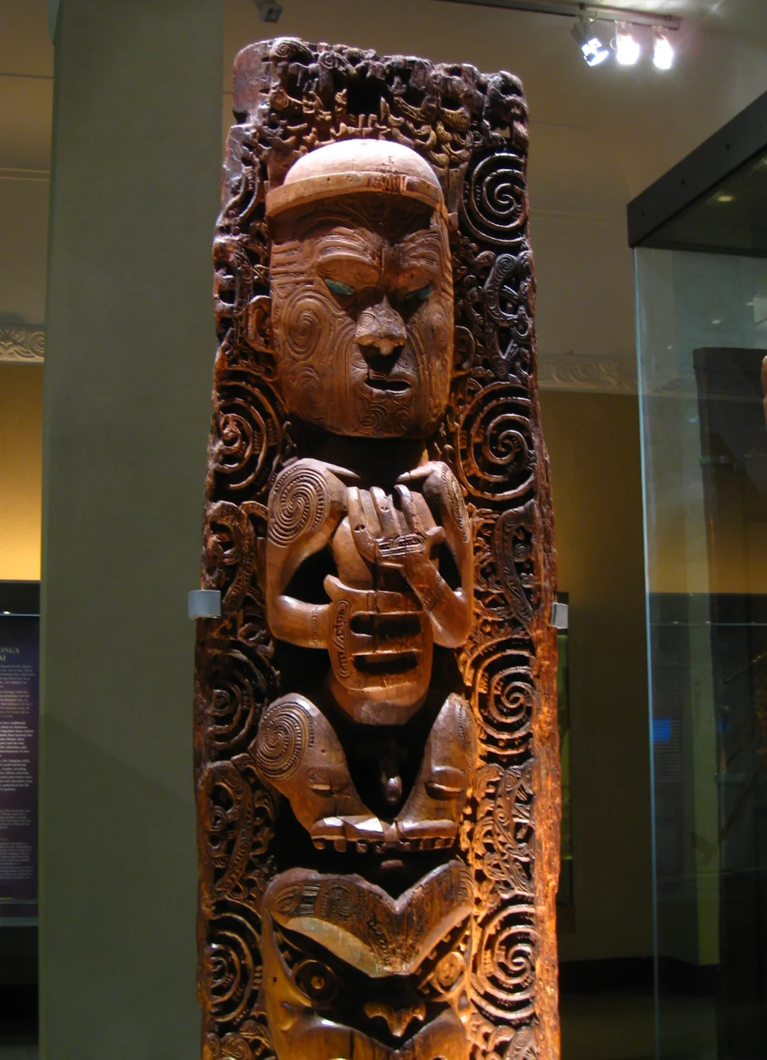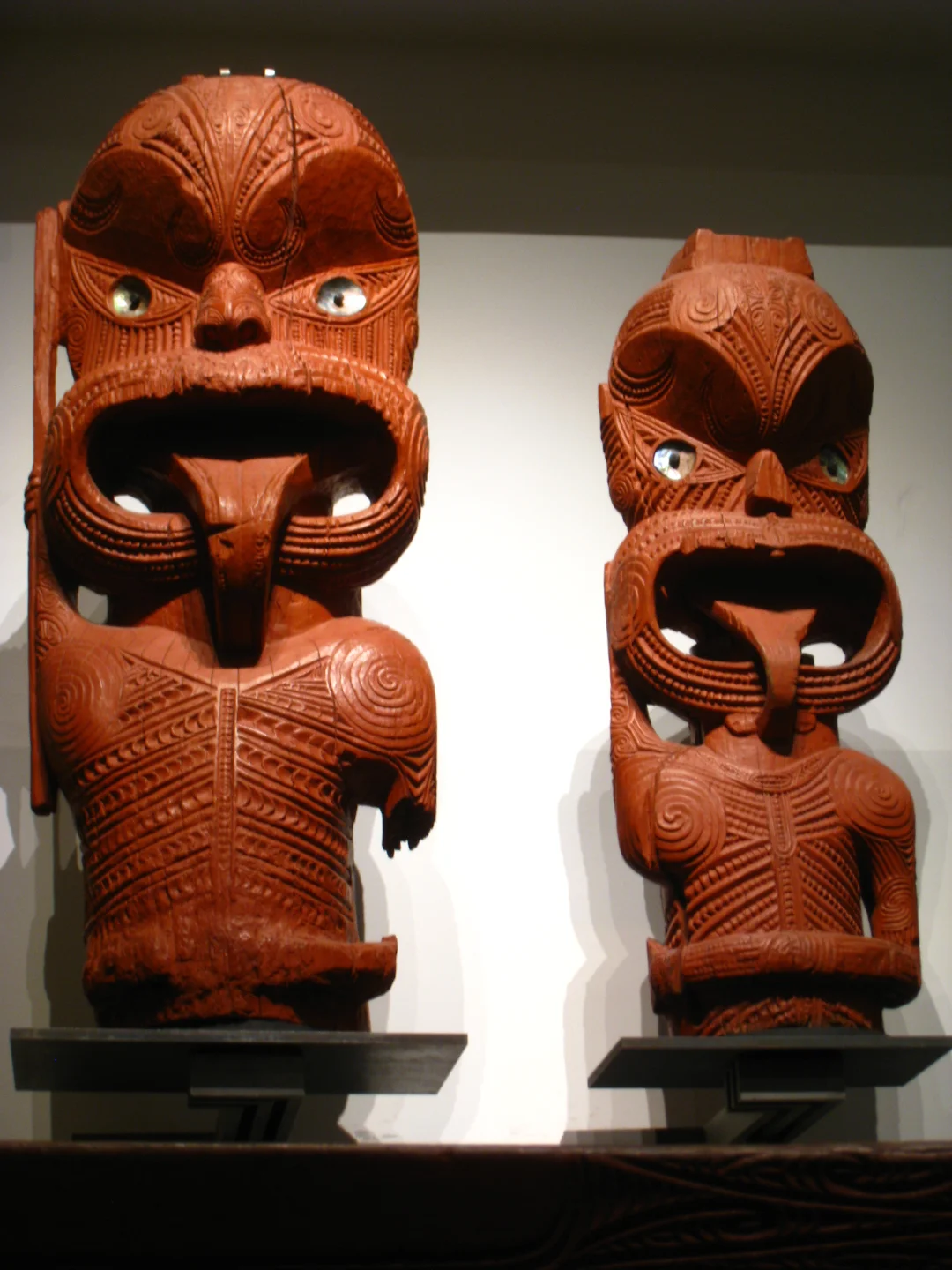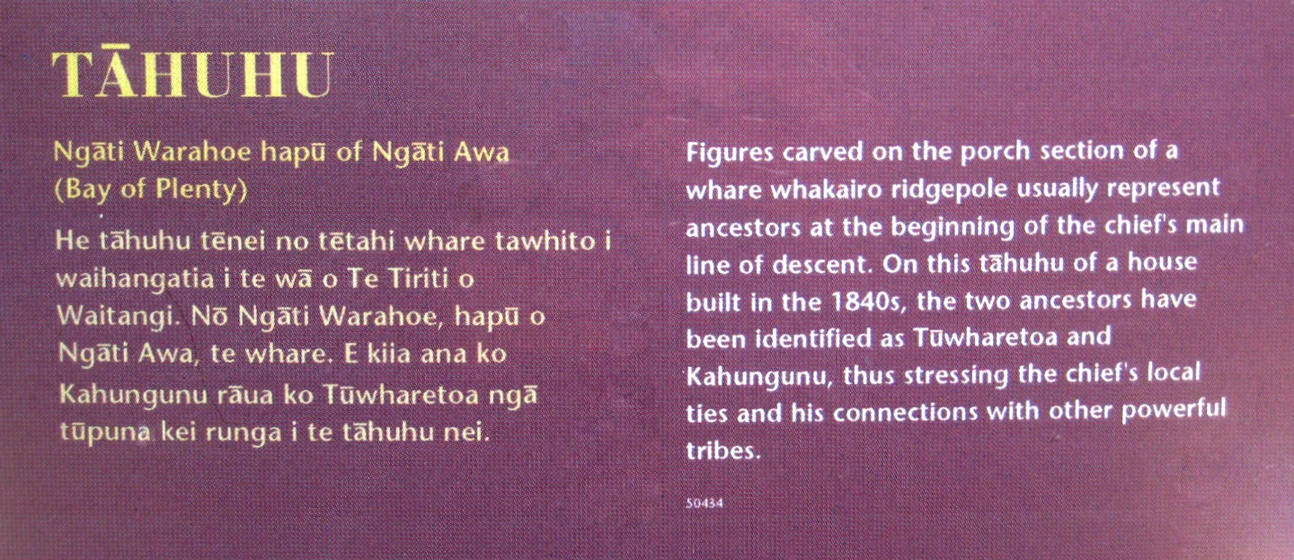 Tāhuhu: Figures carved on the porch section of a whare whakairo ridgepole usually represent ancestors at the beginning of the chief’s main line of descent.