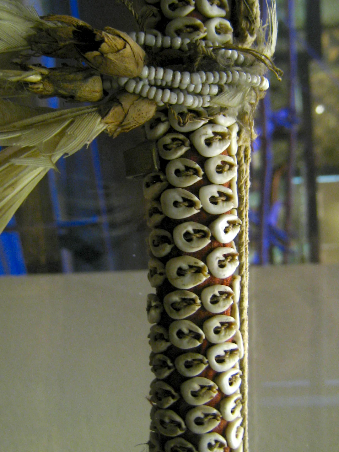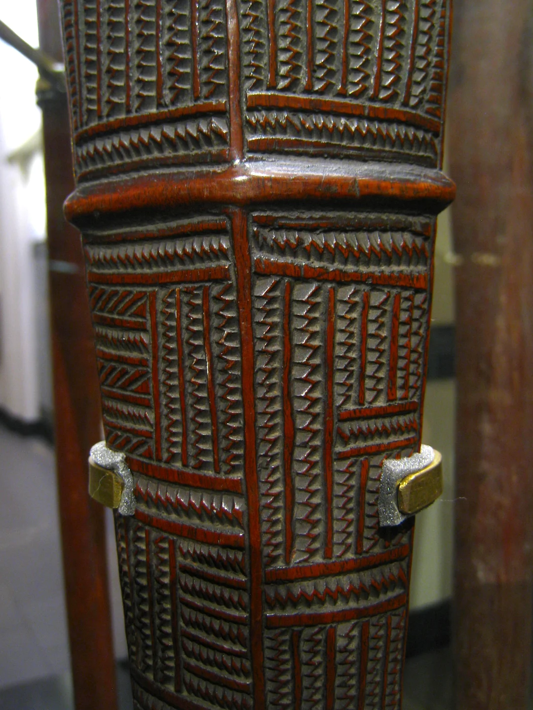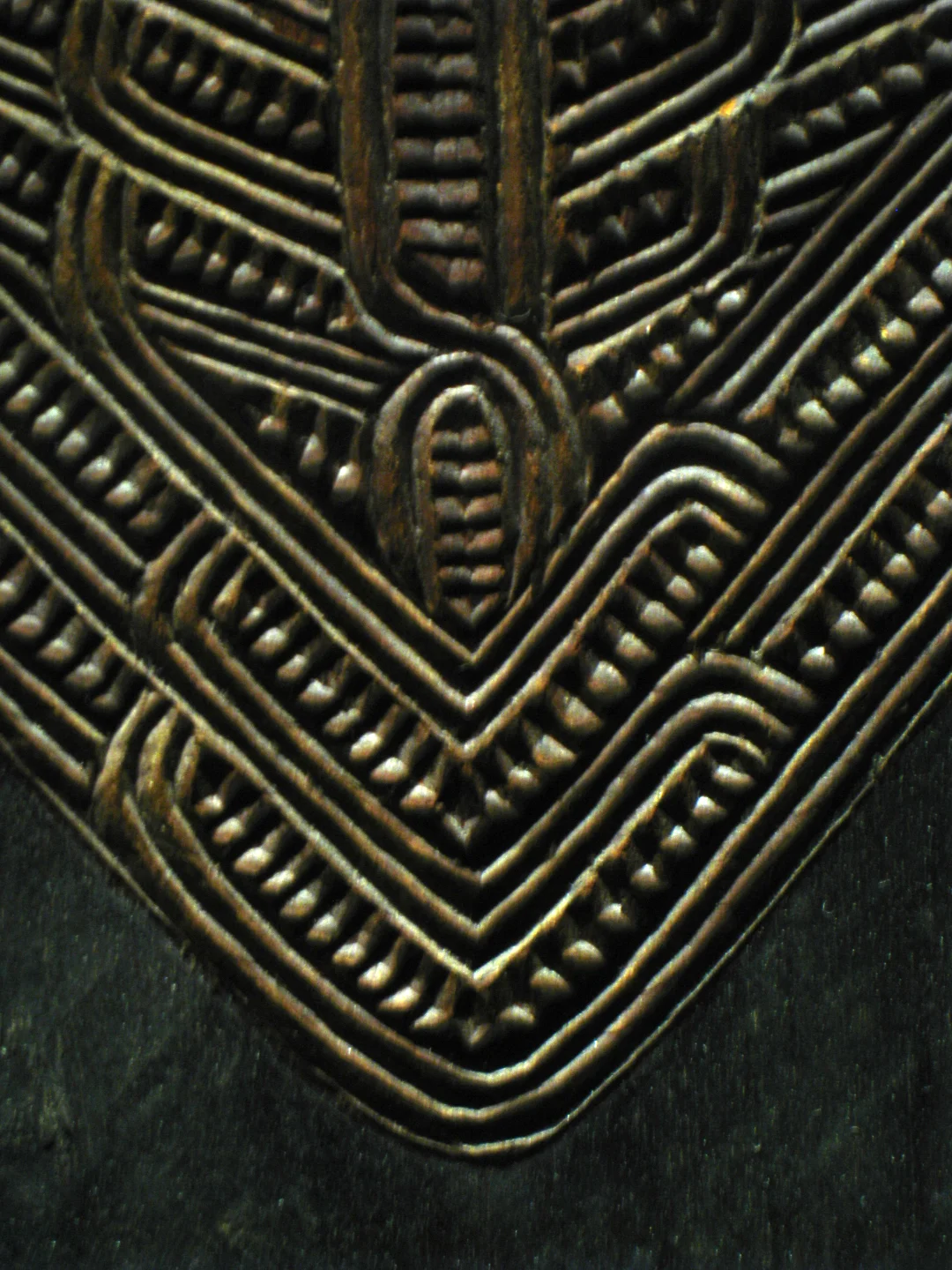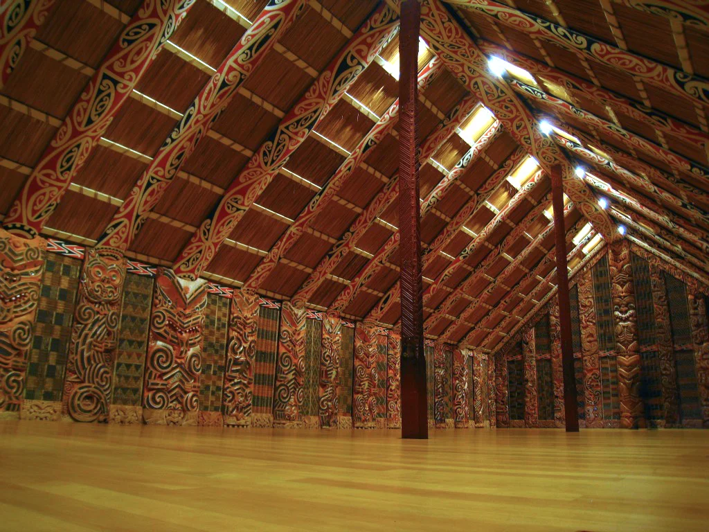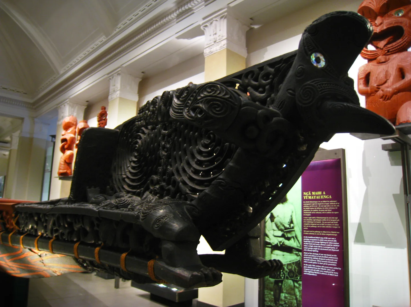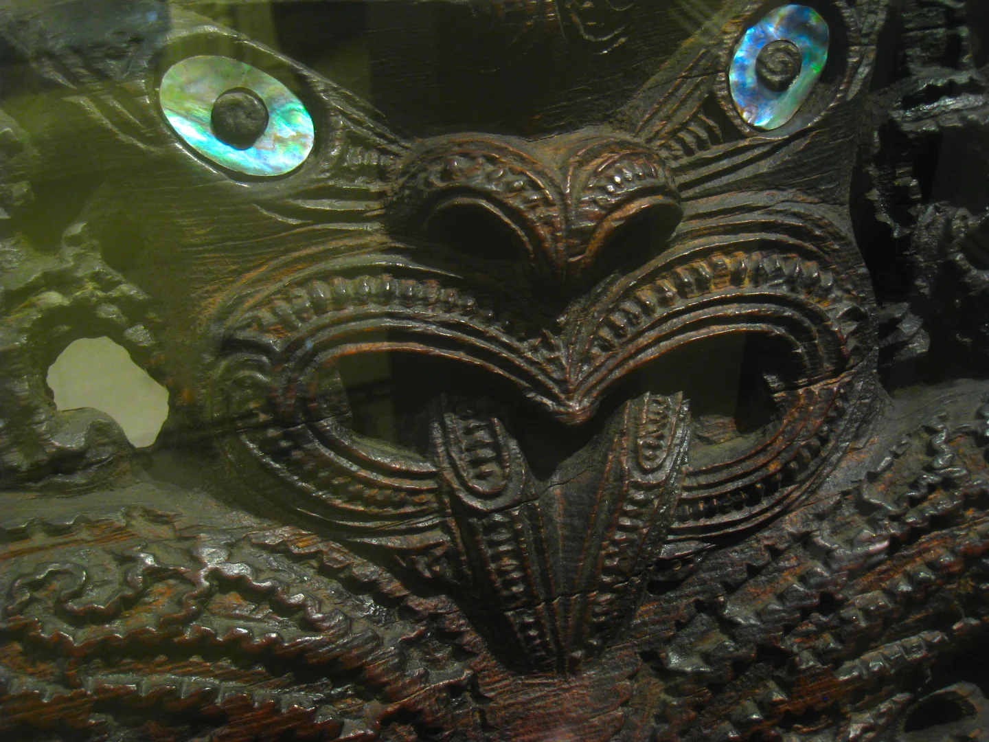 Tāhuhu: Figures carved on the porch section of a whare whakairo ridgepole usually represent ancestors at the beginning of the chief’s main line of descent.