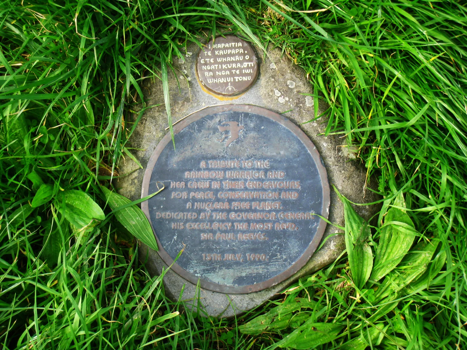 A tribute to the Rainbow Warrior and her crew in their endeavours for peace, conservation and a nuclear free planet. Dedicated by the governor general his excellency the most [REVD?]