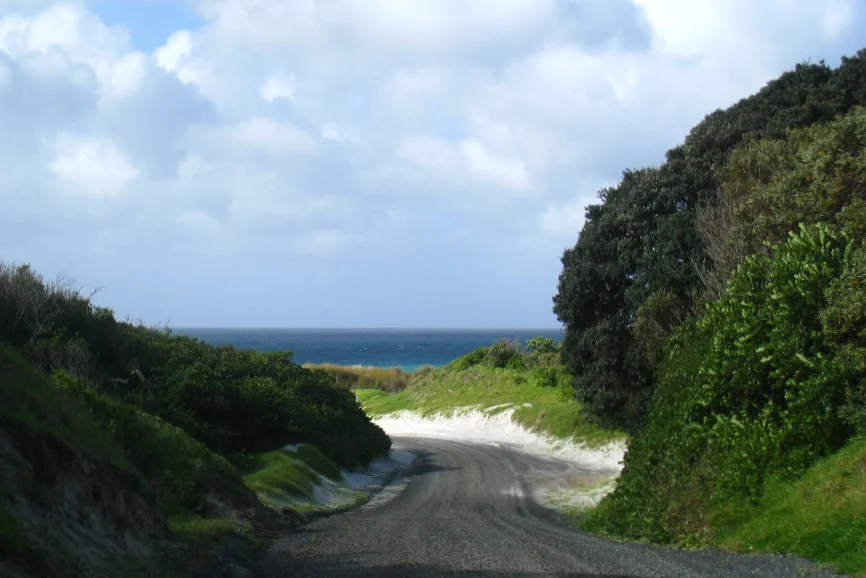 Today we planned to ride along Ninety Mile beach. There is 4 entrances on the way. The next one is about 20km away, then 50km and finally 70km. We aren’t at the beginning, there is already 20km behind us. But we have a little problem : the tide is too high now so we cannot go. After a check at the reception we decided to take the main road and join the beach later.