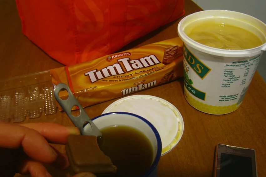 After a good meal, it’s the perfect way to end a journey : Timtam! I discovered these in Australia in 2008 and it’s so sO SO delicious! It’s really difficult not to eat all the packet once opened. Come on! Resist! Ok, the last one. Oooh no there is only three left now… Ok, I’ll keep two for tomorrow. Or one is okay… Yes but if I finish it now I could put the packaging in the bin so I will have less weight to carry. Good idea :-).