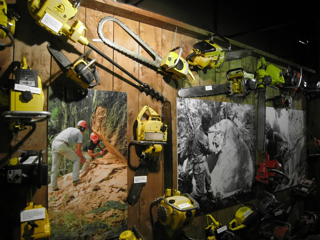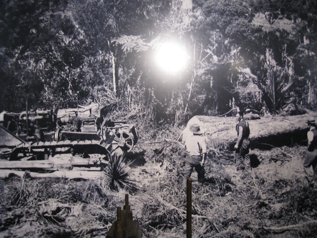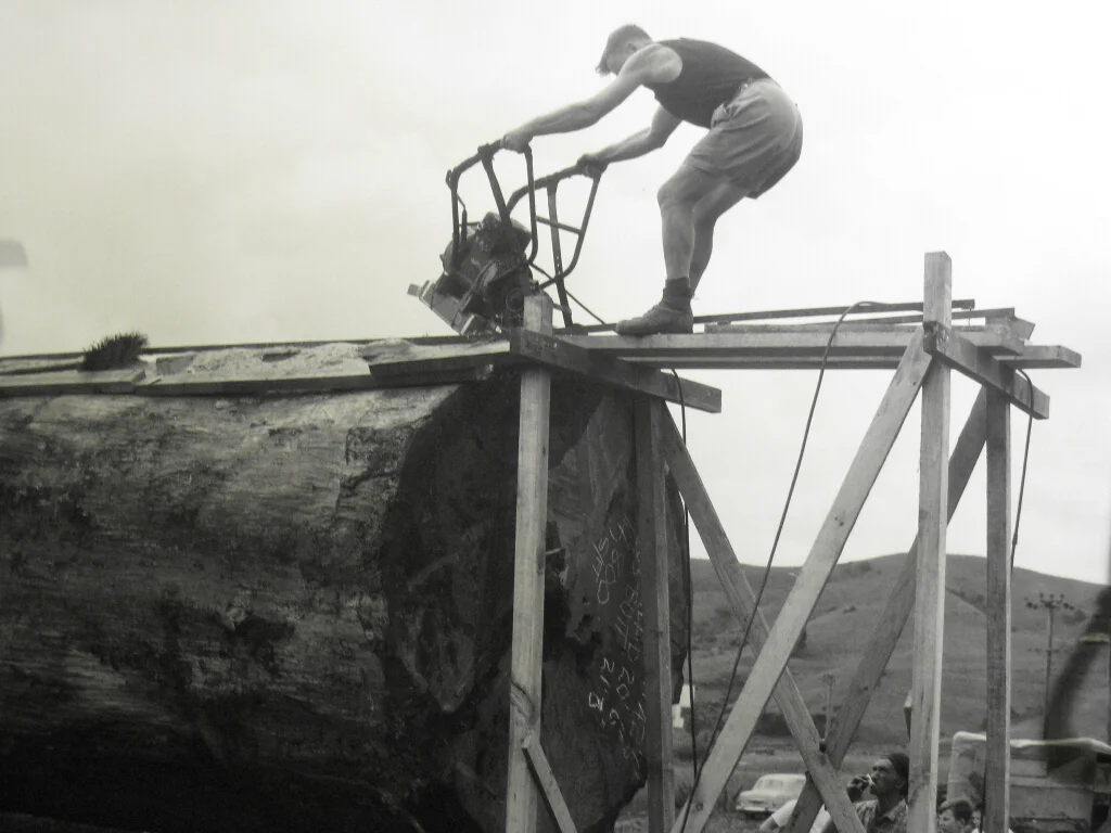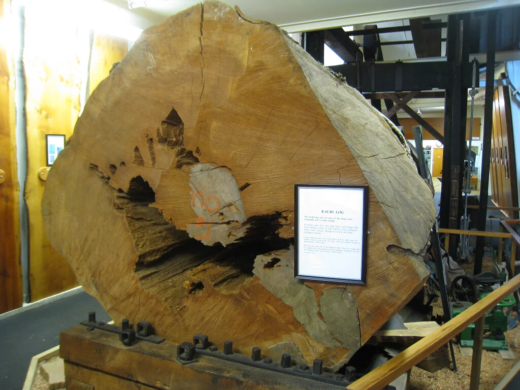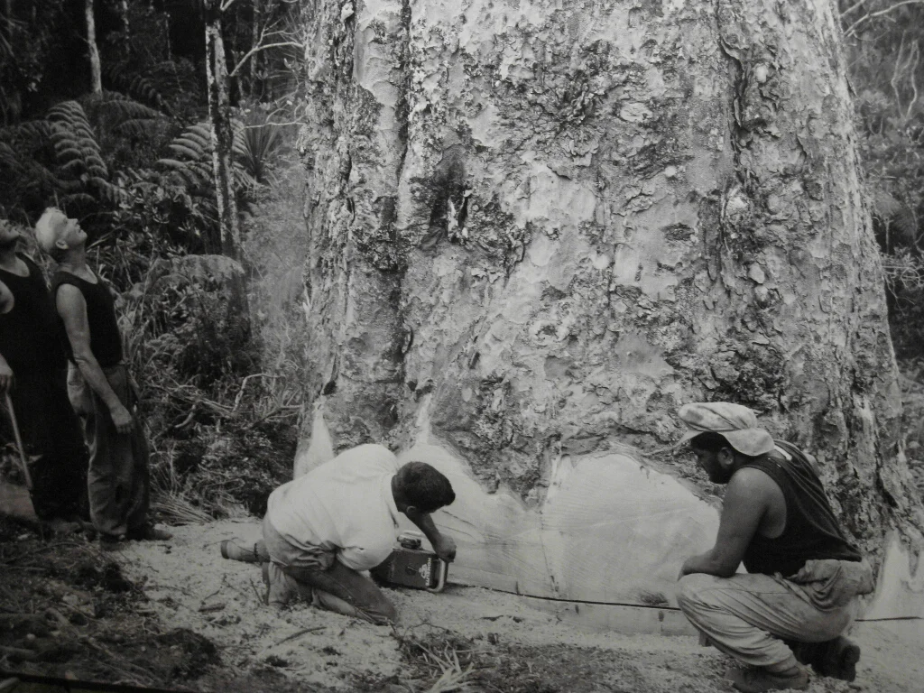 This man is using a very long chain saw to cut this poor Kauri tree.