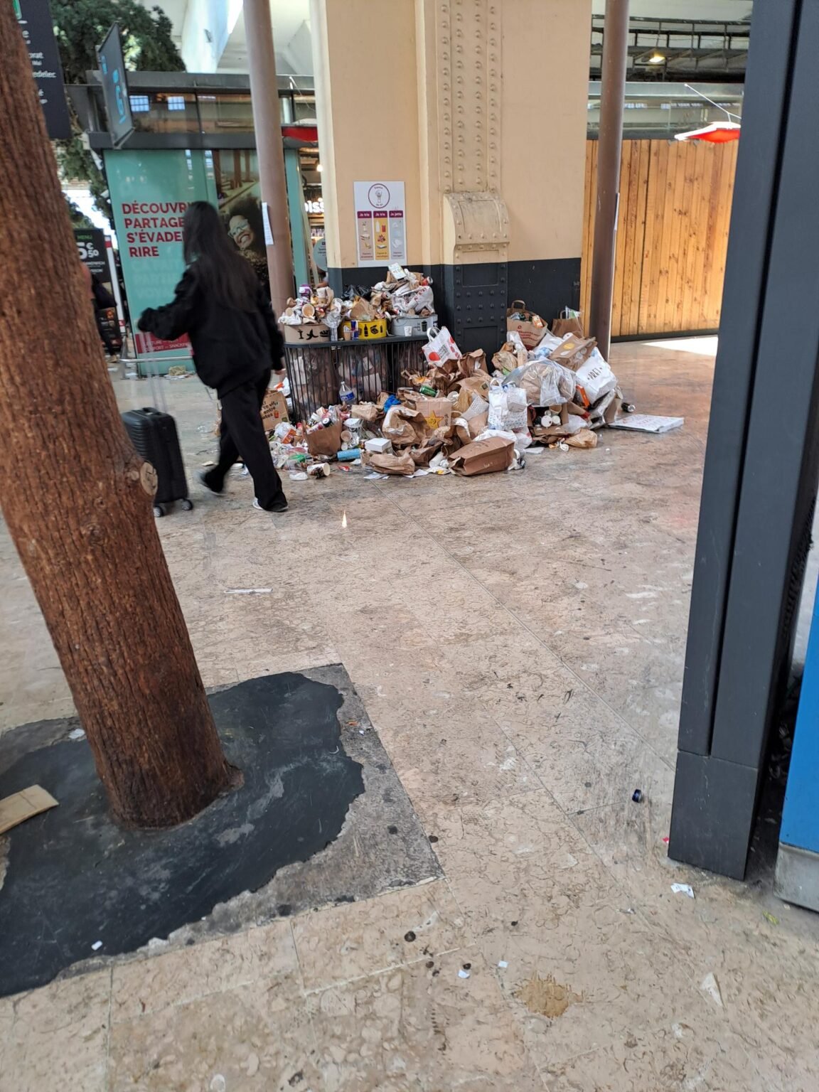 La gare croule sous des montagnes de déchets. Cela ramène à la dur réalité de ce monde de consommation toujours plus vite avec la vente de nourriture à emporté omniprésente. Le train était à l’heure avec un retard de 10 minutes à Toulouse Matabiau, ce qui est dans la normalité.