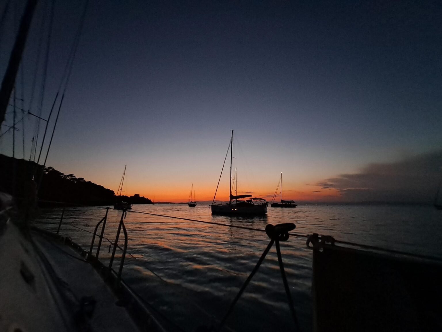 Le début du voyage se termine par ce mouillage fort sympathique face à la plage Notre Dame de l’île de Porquerol. Nous sommes arrivé vers 20h45 avec la petite fraîcheur.