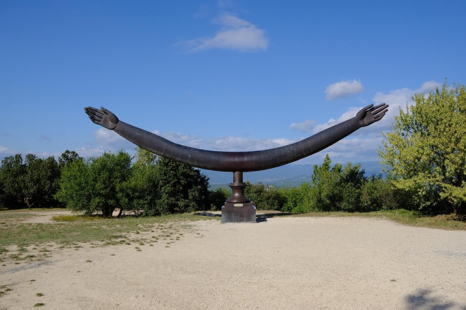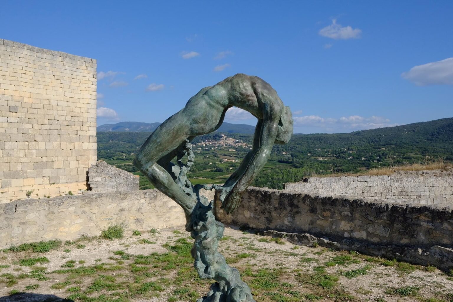 On voit le village de Bonnieux au travers d’une œuvre d’art exposée sur l’esplanade devant le château.