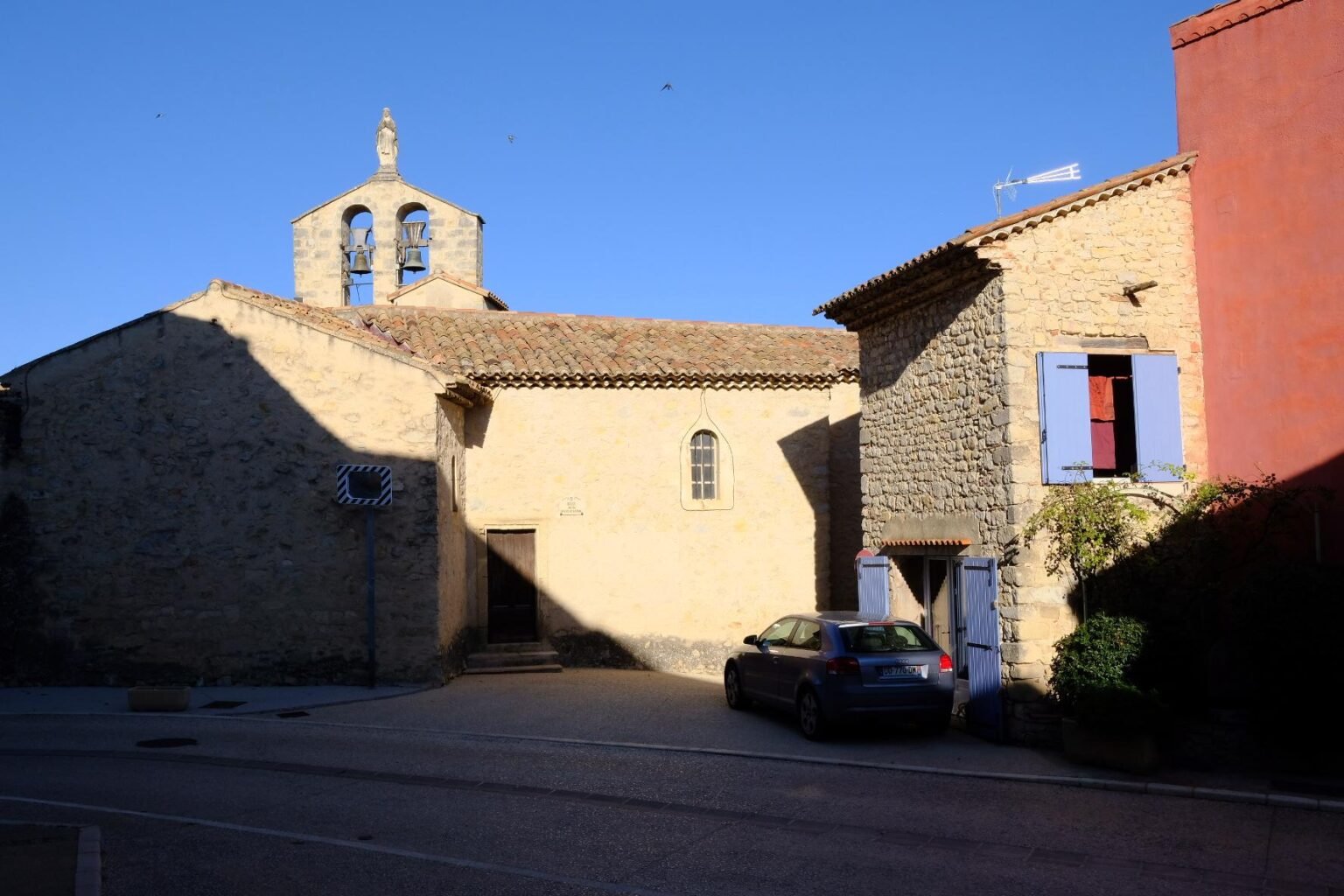 Ensuite on a roulé jusqu’à Pierrevert ou on a pris le pique nique avec le vent. Et puis beaucoup roulé… avec le vent ! Jusqu’à Vitrolles En Lubéron ou on est arrivé avec le VENT ! Le petit village niché contre le massif possède le minimum : une petite église avec une cloche qui sonne les heures, une fontaine, une petite place, et un git ou nous sommrs hébergés. Les maisons sont en bon état. Le château accolé au village est moderne et possède un grand parc en contrebas des ruelles.