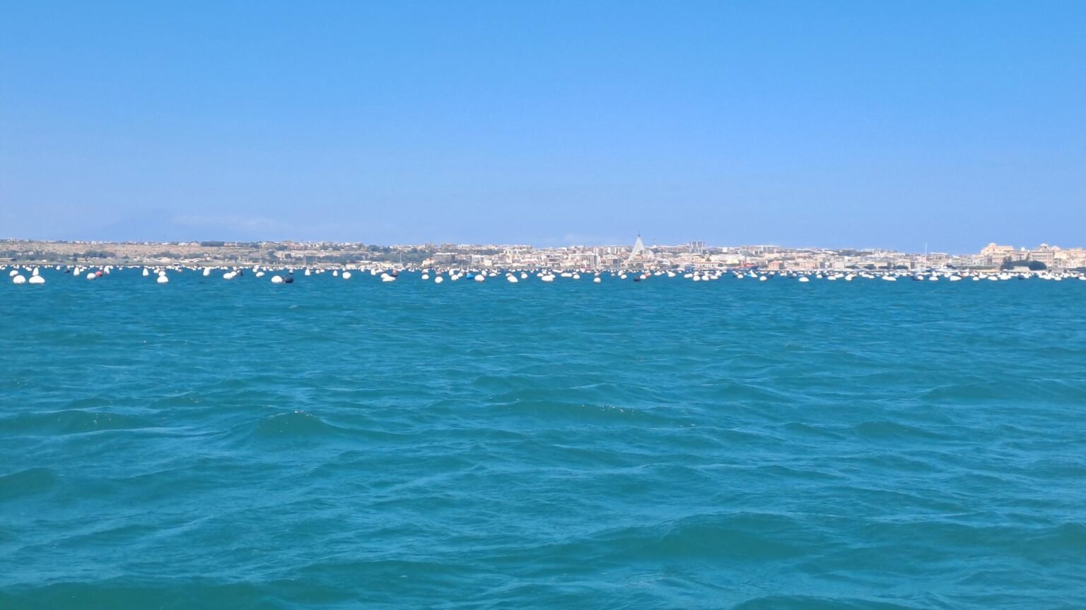 Ce matin on entreprend de faire le tour de la baie de Syracuse. Nous voilà tous les trois sur l'annexe après un bon brunch a voguer face à la houle vers le sud.